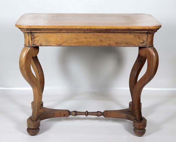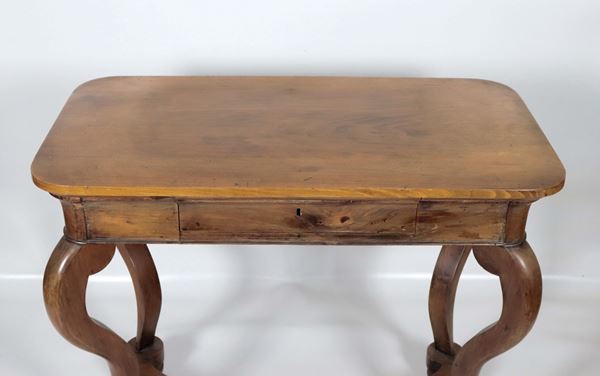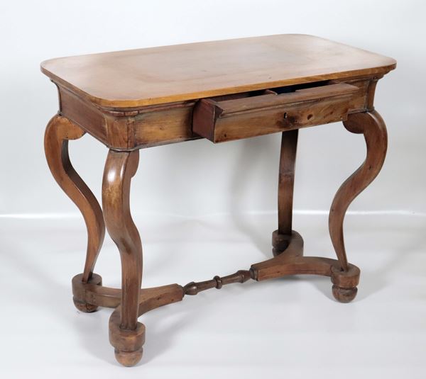 Antique walnut coffee table from the Directoire style, rectangular in shape with a central drawer and four legs joined by a crosspiece undern [..]
