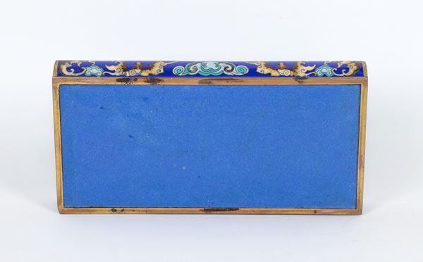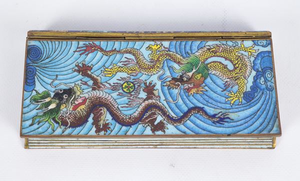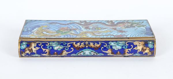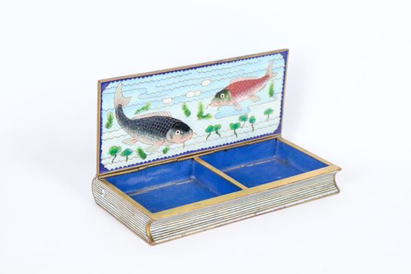 Chinese book-shaped box in bronze and polychrome enamels, with dragon and fish decorations