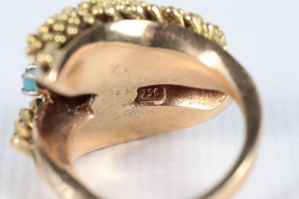 Contrariè ring in 18kt yellow gold with small central turquoises, gr. 20