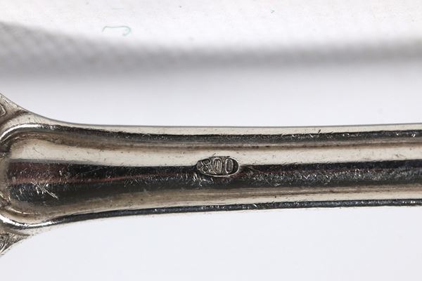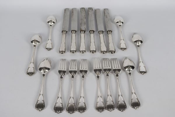 Cutlery set in chiseled and embossed silver: six forks, six spoons and six knives (18 pcs.), gr. 940