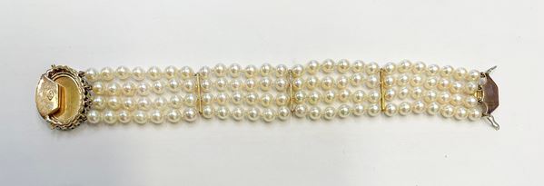 Four-strand pearl bracelet, 18kt yellow gold clasp with oval in polychrome enamel with floral motifs surrounded by small rubies