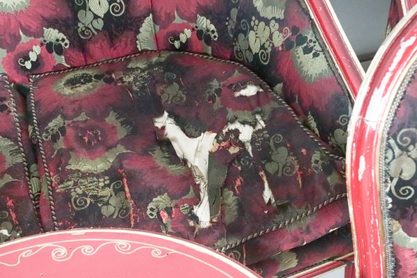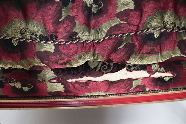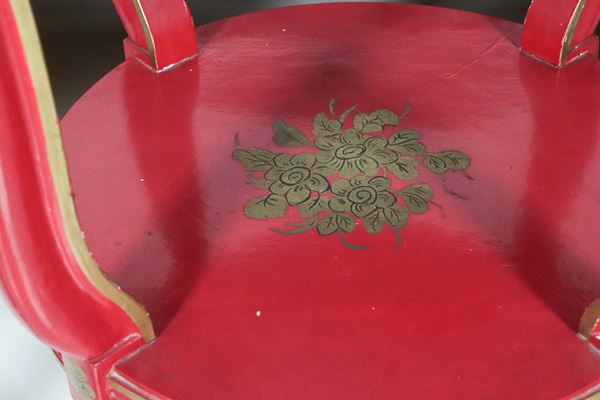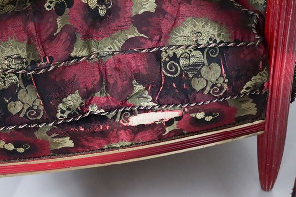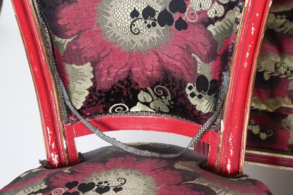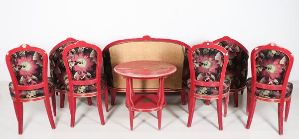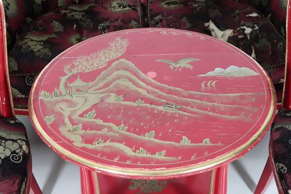 French Liberty living room in red lacquered wood with gold profiles: sofa, two armchairs, four chairs and round table with chinoiserie decorated [..]
