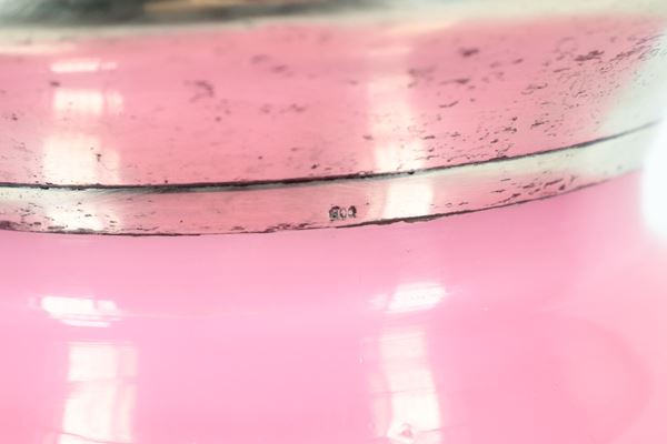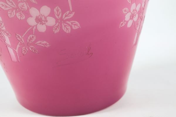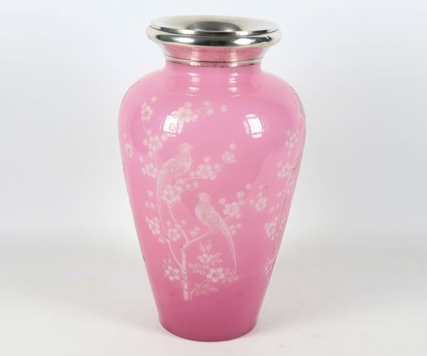 French Liberty vase in pink crystal, with relief decorations of exotic flowers and birds, neck covered in silver. Signed Soleil