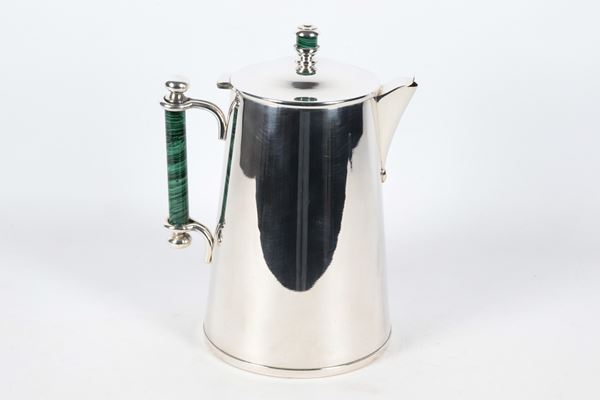 Large coffee pot in silver metal, with knob and handle covered in hard malachite stone