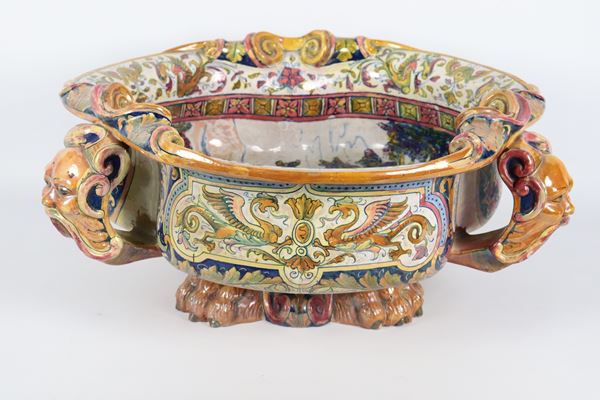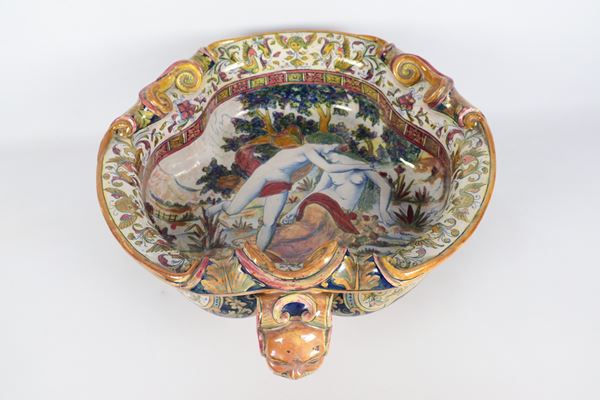 Large Gualdo Tadino glazed majolica basin, marked Alfredo Santarelli (1874-1957), entirely painted with mythological scenes, dragons, masks [..]