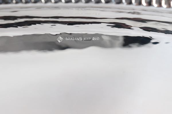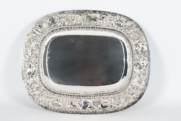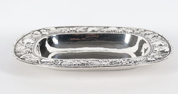 Large rectangular fruit bowl in silver with edge entirely chiseled and embossed with leaf and fruit motifs, marked Braganti - Florence, gr. [..]