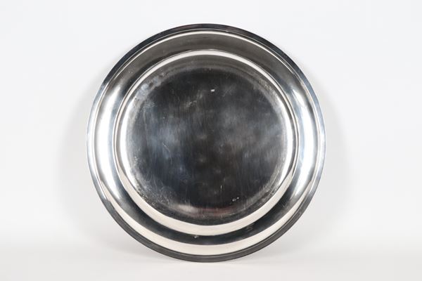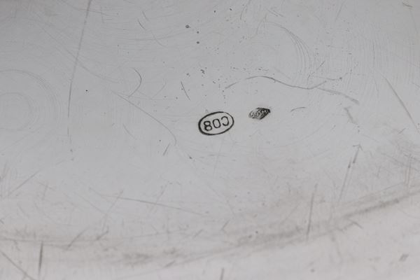 Large round silver serving plate, with chiselled and embossed edge with palmette motifs, 770 g