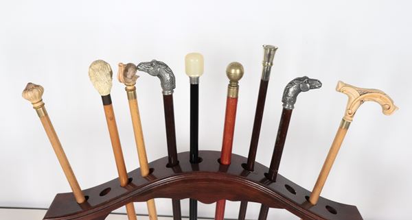 Lot of nine antique walking sticks, with knobs of various shapes and materials, solid mahogany support. The handle of one stick is missing