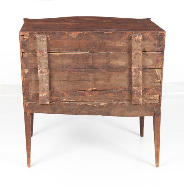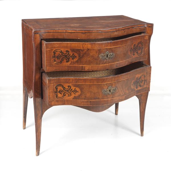 Louis XV Roman chest of drawers in walnut, with inlays of floral fillet motifs and flamed scrolls, two drawers and curved legs