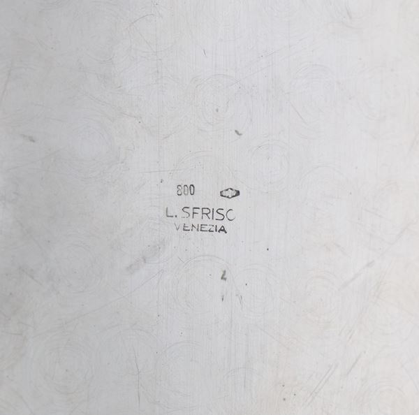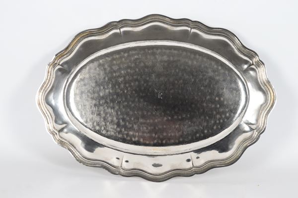 Oval silver serving dish with curved, chiseled and embossed edge, marked L. Frisio - Venice. Fascio Period stamp, gr. 1120