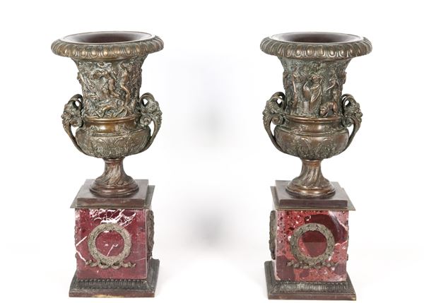 Pair of ancient French Medici amphorae from the Napoleon III era, in chiseled and embossed bronze with motifs of mythological scenes, handles [..]
