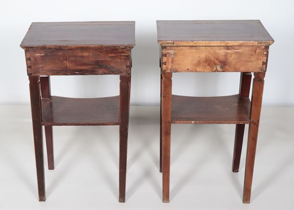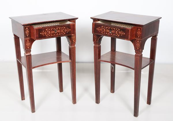 Pair of antique Charles X style mahogany coffee tables, with neoclassical motif inlays, a central drawer and four legs joined by a small shelf [..]