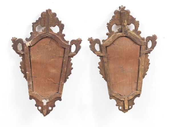 Pair of antique Venetian mirrors in gilded wood and carved with Louis XV motifs, mercury mirrors