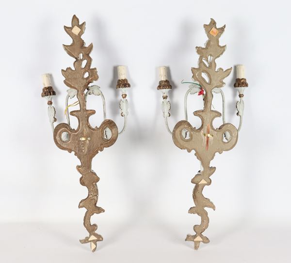Pair of appliques in gilded and ivory lacquered wood, carved with amphora motifs with flowers, 2 lights each. Slight defect