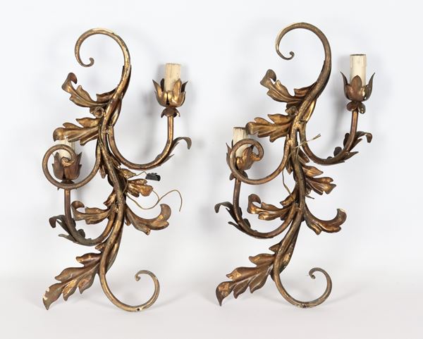Pair of gilded copper appliques with embossed leaf motifs, 2 lights each