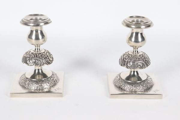 Pair of Russian candlesticks in chiseled and embossed silver, gr. 370. Stamped Moscow 1884