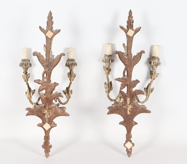 Pair of silvered wooden mecca sconces, carved with amphora motifs with flowers and leaves, 2 lights each