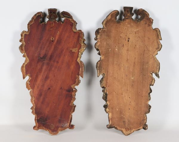 Pair of small mirrors in gilded wood and green lacquer, entirely carved with Louis XV motifs, mercury mirrors. Some missing parts