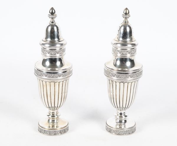 Pair of sugar shakers in chiseled and embossed silver with Empire motifs, gr. 312