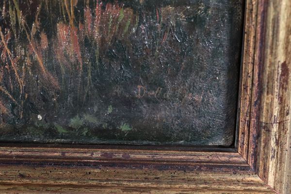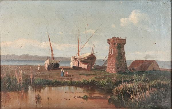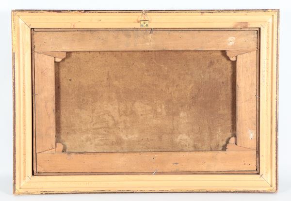 Signed. "Marina with tower and fishing boats in dry dock", small oil painting on canvas in a gilded and carved wooden frame