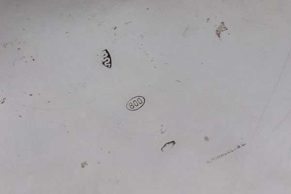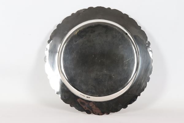 Round silver plate, with chiselled and embossed edge with scroll and shell motifs, 575 gr.