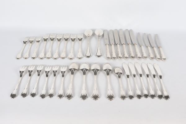 Sambonet embossed and chiselled silver-plated cutlery set: 4 large spoons, 6 large forks, 1 small spoon, 3 small forks, 4 small knives, 6 fish [..]