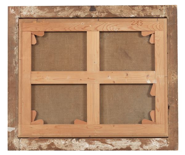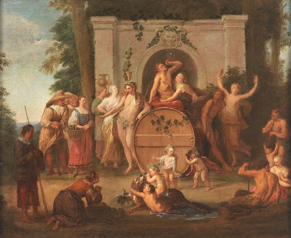 "Architecture with Bacchanal", bright and fine oil painting on canvas in a gold and green lacquered frame