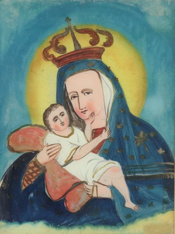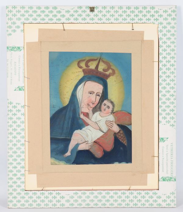 "Madonna with Child", small oil painting under glass in carved frame and passepartout