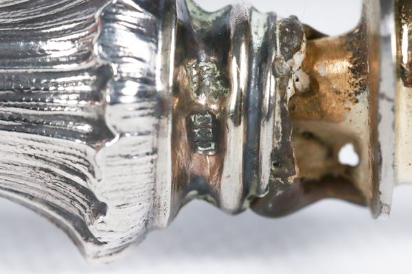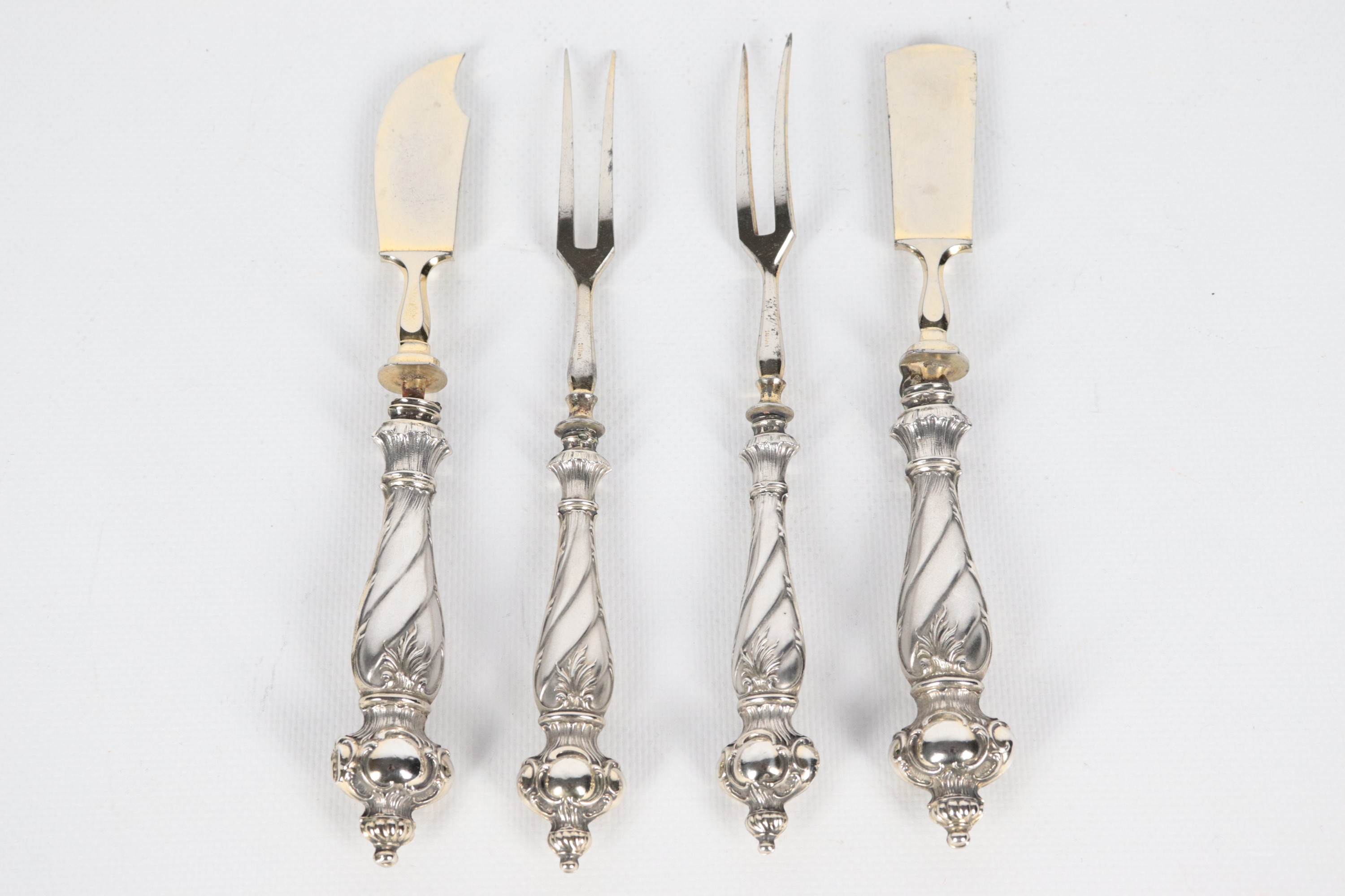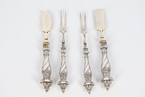 Set of four cheese cutlery with chiselled and embossed silver handles, with original damaged case
