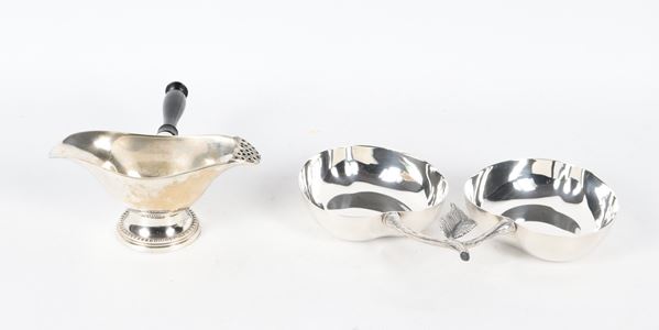 Silver-plated and embossed metal lot of a small gravy boat for roasts and a cherry-shaped candy holder (2 pcs.)