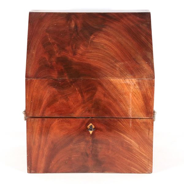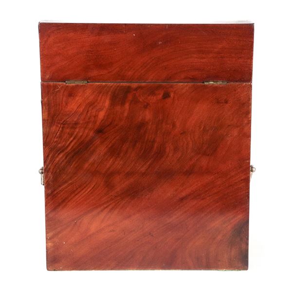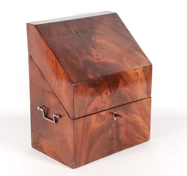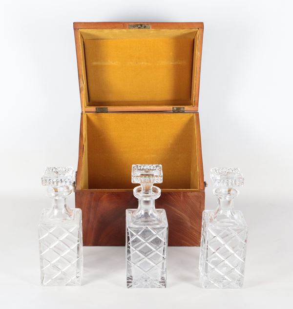 Antica scatola da viaggio in mogano, all'interno tre bottiglie da liquore in cristallo lavorato