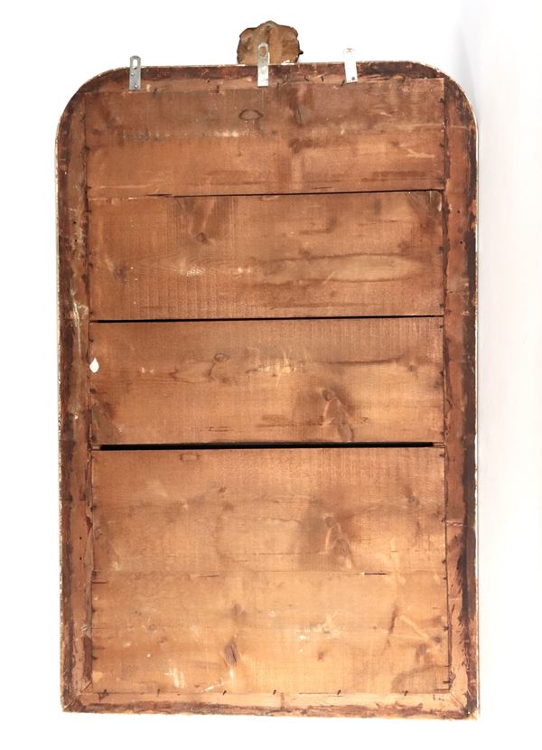 Antica specchiera napoletana Luigi Filippo, in legno dorato e intagliato con piccola cimasa lavorata. La cimasa presenta difetti