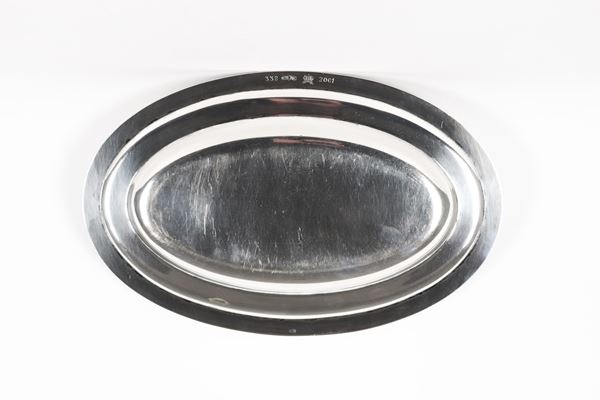 Antico piccolo vassoio inglese in sheffield, con bordo cesellato e sbalzato a motivi neoclassici