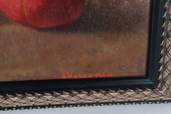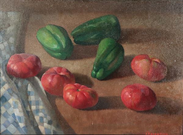 Firmato. "Natura morta di peperoni e pomodori", dipinto ad olio su compensato in cornice in legno decorato