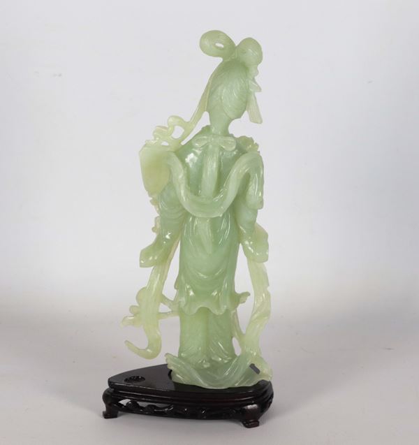 "Guanyin con ventaglio e fiore", piccola scultura in giada verde, annessa basetta in teak. Lievi mancanze