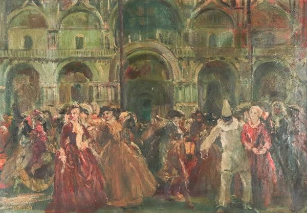 Firmato. "Festa di Carnevale a Venezia", dipinto ad olio su tela, cornice in legno dorato e passepartout marrone