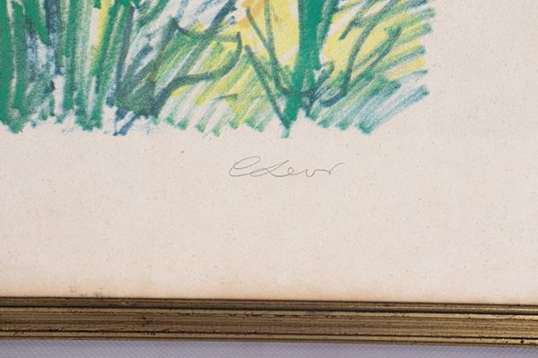 "Fiori al vento", litografia a colori su carta multiplo 118/120, cornice in legno dorato