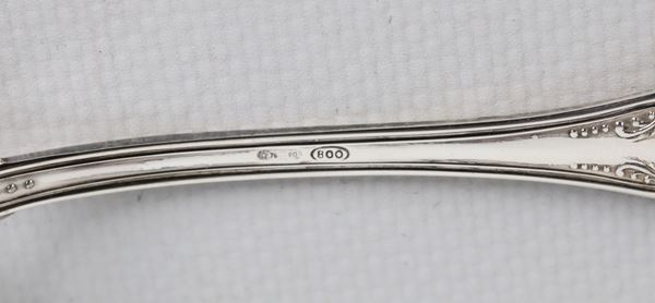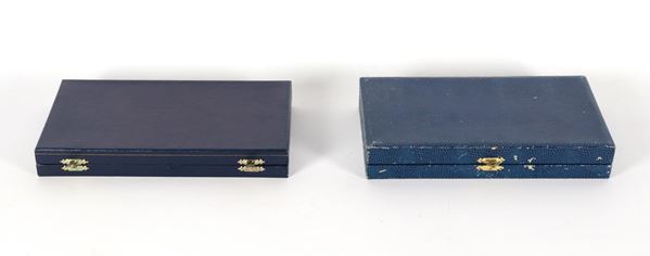 Lotto di due set di tre posate da bambino in argento cesellato e sbalzato con annessi astucci originali. Peso totale dell'argento gr. 135