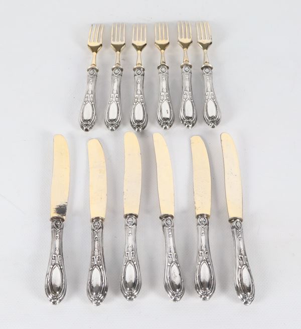 Lotto di sei forchette e sei coltelli da dolce con manici rivestiti in argento cesellato e sbalzato (12 pz.)