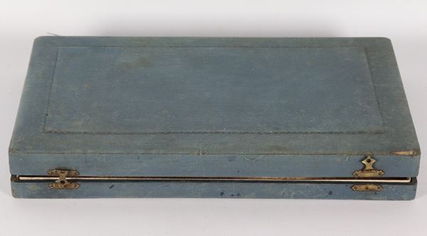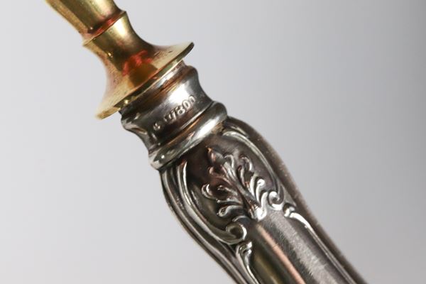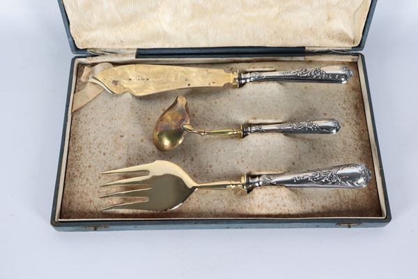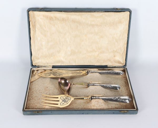 Lotto di tre posate da portata con manici rivestiti in argento cesellato e sbalzato e vermeil, annesso astuccio (3 pz.)