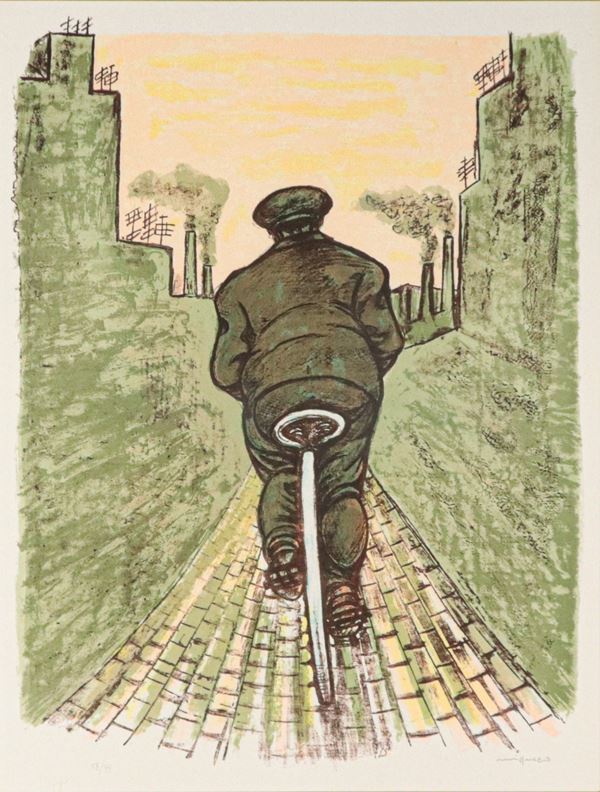 'Uomo in bicicletta', litografia a colori su carta, multiplo 18/99. Firmata. Cornice in legno argentato e passepartout