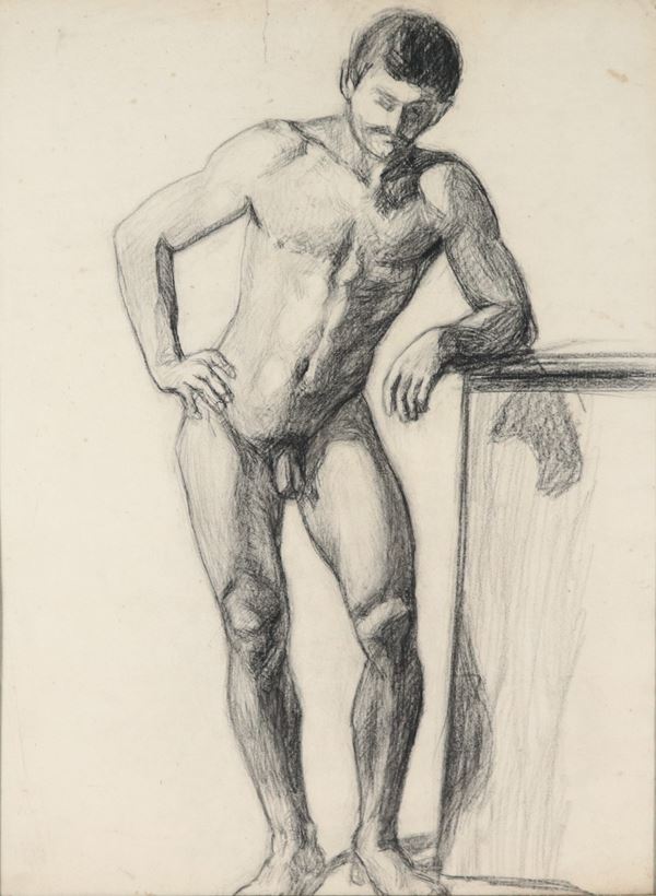 "Nudo di uomo", disegno a matita e carboncino su carta in cornice in legno a mecca