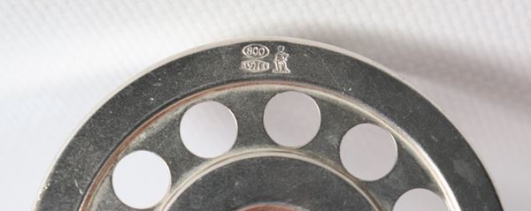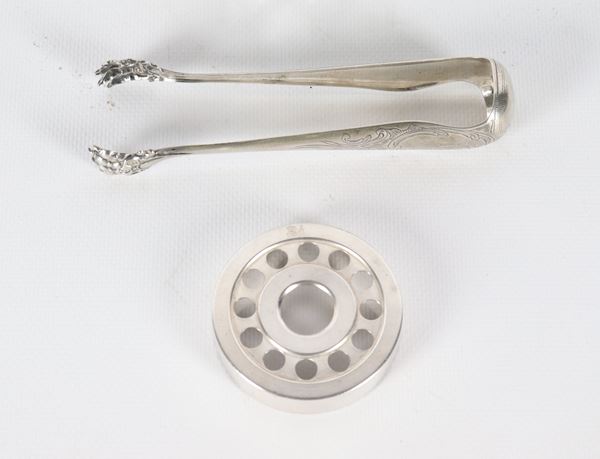 Portaghiaccio in cristallo lavorato con bordo, manico e pinza in argento cesellato