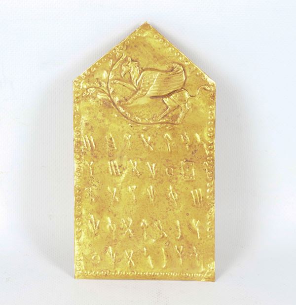 "Scena dell'Antica Grecia", antica piccola placca in rame dorato, cesellato e sbalzato