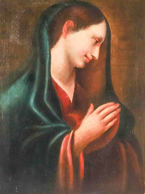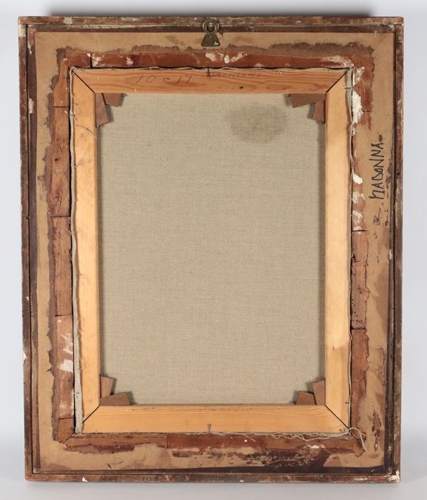 "Madonna in preghiera", piccolo dipinto ad olio su tela in antica cornice in legno dorato e intagliato