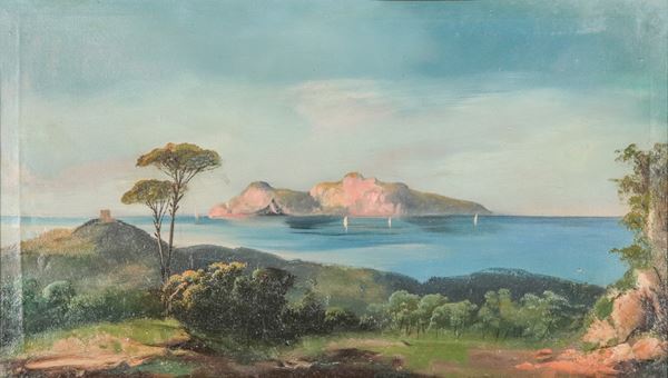 Firmato. 'Marina con veduta di Nisida', luminoso dipinto ad olio su tela in cornice in legno dorato e intagliato