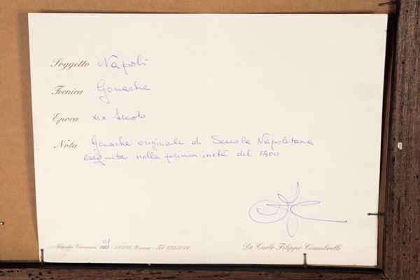 "Veduta del Golfo di Napoli con il Vesuvio e barche di pescatori", gouache su carta in cornice ebanizzata e dorata