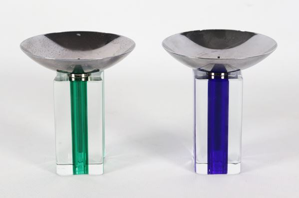 Venini. Coppia di portacandele Candelboi blu e verde smeraldo, in vetro soffiato di Murano e metallo cromato. Firma a punta Venini 2000