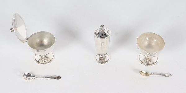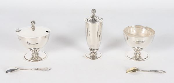 George V silver lot, salt shaker, pepper shaker and mustard jar (3 pcs.), gr. 180