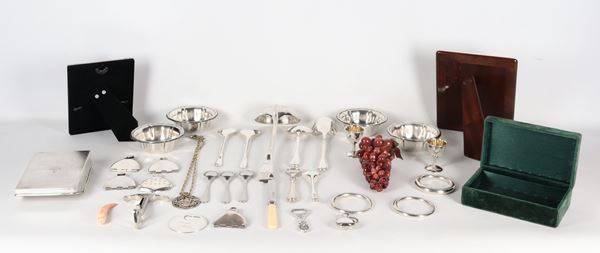 various serving cutlery, 2 egg cups, bracelets, 1 bunch of grapes in hard stone, 1 card holder, 4 cups, 1 velvet box, 2 photo frames and 1 chain with pendant